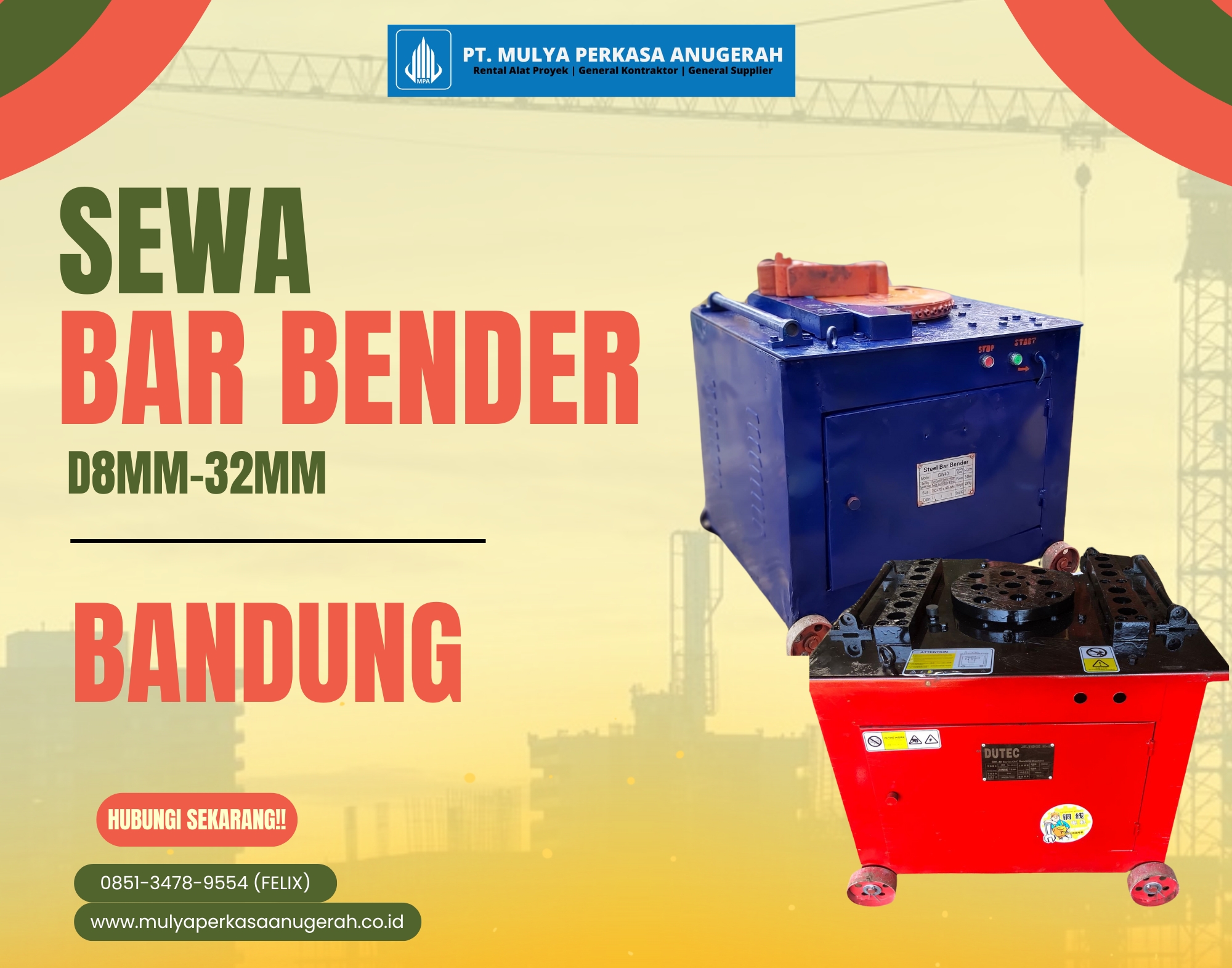PT Mulya Perkasa Anugerah telah berpengalaman dalam bidang penyewaan alat berat dan alat konstruksi selama bertahun-tahun. Dengan reputasi yang sudah teruji, kami menyediakan layanan sewa Bar Bender Bandung untuk berbagai kebutuhan konstruksi seperti pembangunan gudang, pabrik, gedung bertingkat, jalan, dan infrastruktur lainnya.