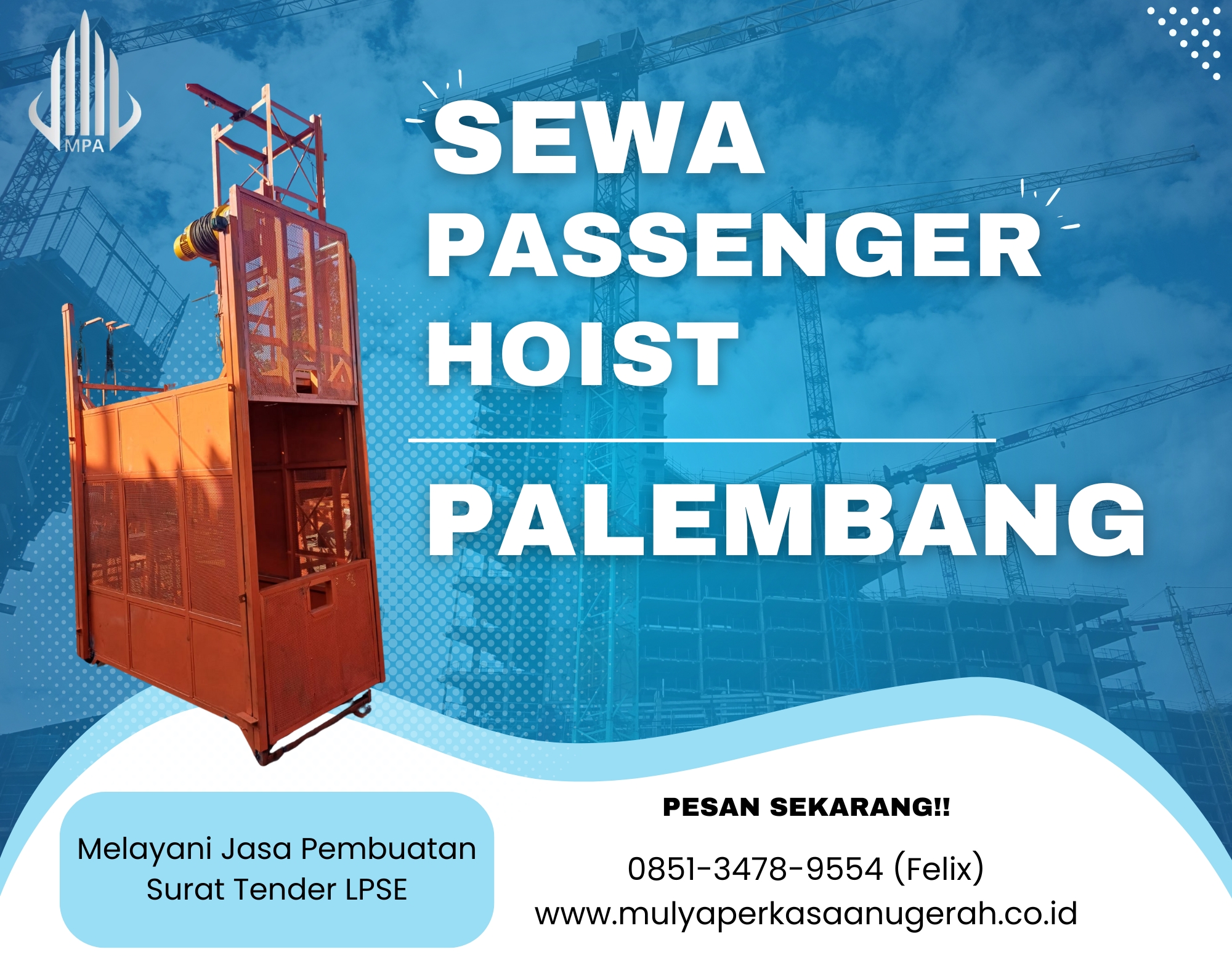 Jika Anda sedang butuh sewa passenger hoist di Palembang. Anda berada di tempat yang tepat! Passenger hoist merupakan alat vital dalam proyek konstruksi, terutama untuk mengangkut pekerja dan material secara aman dan efisien ke ketinggian. Di Palembang, permintaan akan penyewaan passenger hoist terus meningkat seiring dengan berkembangnya proyek-proyek pembangunan, baik gedung bertingkat, industri, maupun renovasi besar. Lihat Artikel Sebelumnya Dalam artikel ini, kami akan membahas secara lengkap tentang sewa passenger hoist di Palembang, mulai dari manfaat, jenis, harga, tips pemilihan, hingga rekomendasi penyedia jasa terpercaya. Simak informasi berikut untuk memastikan Anda mendapatkan solusi terbaik! Apa Itu Passenger Hoist? Passenger hoist adalah alat pengangkut vertikal yang dirancang khusus untuk memindahkan pekerja dan material konstruksi secara aman. Alat ini sering digunakan dalam proyek pembangunan gedung tinggi, menara, pabrik, atau proyek infrastruktur lainnya. Beberapa fitur utama passenger hoist: –Kapasitas angkut tinggi (biasanya 1 Ton – 4 Ton).–Keamanan terjamin dengan sistem rem darurat dan pengunci otomatis.–Efisiensi waktu karena dapat mengangkut banyak orang sekaligus.–Dilengkapi dengan cabin untuk kenyamanan dan perlindungan dari cuaca. Mengapa Sewa Passenger Hoist di Palembang Lebih Menguntungkan? Banyak kontraktor dan developer memilih sewa passenger hoist di Palembang daripada membeli karena beberapa alasan: Jenis-Jenis Passenger Hoist yang Tersedia untuk Di sewa di wilayah Palembang Berikut beberapa jenis passenger hoist yang umum disewakan di Palembang: 1. Single Cabin Passenger Hoist Passenger hoist secara aktif mendukung proyek kecil hingga menengah, terutama yang membutuhkan mobilitas vertikal cepat dan aman. Passenger hoist memiliki kapasitas angkut terbatas 1 – 4 Ton, dan tidak bisa digunakan mengangkut orang secara bersamaan. Efisiensinya dalam mempercepat proses perpindahan pekerja dan material menjadikannya pilihan favorit di berbagai proyek pembangunan modern di Palembang. 2. Double Cabin Passenger Hoist 3. Material-Passenger Combination Hoist Tips Memilih Penyewa Passenger Hoist di Palembang – PT Mulya Perkasa Anugerah Agar tidak salah pilih, perhatikan hal berikut: –Reputasi Perusahaan – Kami memiliki reputasi yang baik, dan sudah bekerjasama dengan proyek – proyek di seluruh Indonesia, dan tingkat profesional yang kami miliki sangat tinggi dalam menyewakan passenger hoist.–Kualitas Alat – Kami menyewakan alat dengan kualitas yang bagus dan terawat.–Layanan Purna Jual – Kami siap memberikan garansi dukungan teknis jika terjadi masalah pada alat.–Harga Transparan – Harga Sangat Terjangkau.-Fleksibilitas Kontrak – Hubungi admin pada Website kami jika ingin menyewa passenger hoist. Cara Sewa Passenger Hoist di PT Mulya Perkasa Anugerah Proses Sewa Passenger Hoist di PT. Mulya Perkasa Anugerah sangat mudah dan efisien:1. Cara yang Pertama, hubungi tim kami (0851-3478-9554 Felix) melalui telepon atau WhatsApp untuk konsultasi kebutuhan.2. Cara kedua, tentukan jenis cabin (Single/Double Cabin), kebutuhan besi yang ingin dibengkokan dan durasi sewa sesuai kebutuhan. Komunikasikan spesifikasi proyek dengan jelas agar penyedia dapat merekomendasikan bar bender yang tepat dan efisien.3. Cara yang Ketiga, kami akan mengirimkan penawaran harga yang kompetitif.4. Cara yang Keempat, setelah deal, kami akan mengirimkan bar bender ke lokasi Anda. Palembang: Kota Bertumbuh Pesat dengan Meningkatnya Permintaan Sewa Passenger Hoist Sebagai ibu kota Provinsi Sumatera Selatan, Palembang kini menjelma menjadi salah satu kota besar di Indonesia dengan pertumbuhan pembangunan yang sangat pesat. Tidak hanya dikenal sebagai kota bersejarah dengan ikon Jembatan Ampera dan Sungai Musi, Palembang kini juga menjadi pusat pertumbuhan ekonomi, industri, dan infrastruktur modern di Pulau Sumatera. Seiring maraknya pembangunan gedung bertingkat, hotel, apartemen, dan pusat perbelanjaan, kebutuhan akan alat bantu konstruksi seperti passenger hoist di Palembang terus meningkat. Tak hanya itu, dalam beberapa tahun terakhir, Palembang mengalami transformasi besar-besaran di berbagai sektor. Selain menjadi tuan rumah Asian Games 2018 yang mendorong percepatan pembangunan infrastruktur, kota ini juga aktif membangun jalan tol, flyover, kawasan bisnis baru, serta proyek-proyek properti skala besar di berbagai wilayah strategis seperti Jakabaring, Ilir Barat, hingga Seberang Ulu. Pertumbuhan jumlah proyek bertingkat di Palembang berdampak langsung pada tingginya permintaan sewa passenger hoist. Passenger hoist, atau lift proyek, merupakan solusi penting yang memungkinkan pengangkutan tenaga kerja dan material bangunan ke lantai atas secara lebih cepat, efisien, dan aman dibandingkan dengan metode konvensional seperti tangga atau alat angkut manual. Banyak pengembang dan kontraktor di Palembang kini lebih memilih menyewa passenger hoist karena lebih fleksibel, hemat biaya, dan didukung layanan teknis, sejalan dengan kebutuhan proyek yang dinamis dan berstandar keselamatan tinggi. KAMI MELAYANI PENGIRIMAN SELURUH INDONESIA DAN JASA PEMBUATAN SURAT TENDER LPSE!! PRODUK KAMI – PT MULYA PERKASA ANUGERAH Lihat Artikel Lainnya TEMUKAN KAMI DI BERBAGAI MARKETPLACE Hubungi Kami Sekarang!! Tak perlu repot angkut barang! Gunakan Passenger Hoist Palembang untuk solusi cepat, aman, dan efisien. Hubungi (0851-3478-9554 Felix) untuk konsultasi & penawaran terbaik. 📞 Hubungi Kami✉ Email Kami